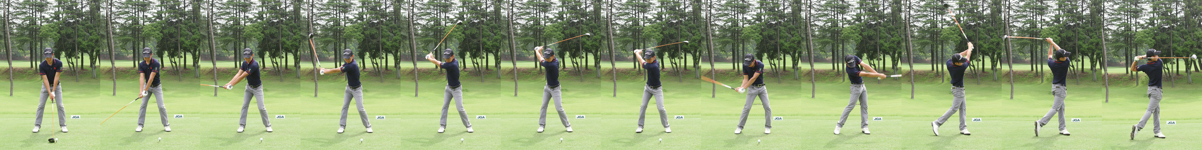 非常にバランスが取れたアドレスから両腕の三角形を崩さず、基本に忠実なバックスイングをしている。インパクトでは体のほぼ中心でボールを捕らえているが、フォローサイドでヘッドを飛球線に対して真っ直ぐに動かす意識が強すぎるのか、左脇が空いてしまっているのが残念だ。| クラブ | ヘッド | シャフト | スペック |