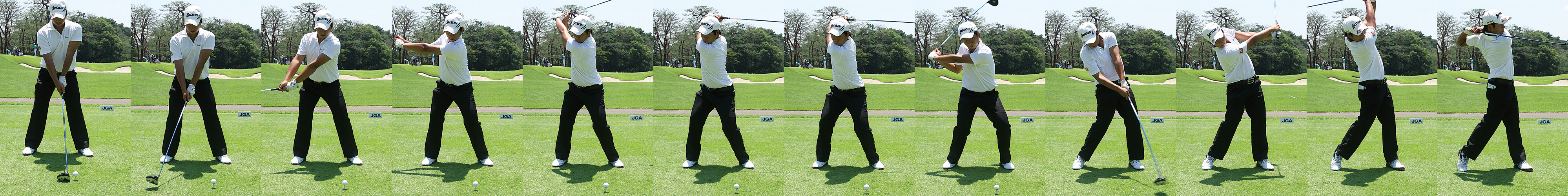 トップスイングで上体は十分捩れているが、右股関節に体重を乗せきれてはいないようだ。右股関節の使い方をマスターしたなら、もっと楽にトップスイングを作れるようになるはずだ。ダウンスイングからは体が右足軸でしっかりとボールを捕らえている。インパクト時に体の正面でヒットしているのは素晴らしい。決して悪くはないのだが、フォローサイドでの体のターンが少ないために、フェースローテーション量が多くなっている。| クラブ | ヘッド | シャフト | スペック |